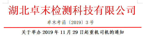为满足起重机司机人员取证和复审要求,湖北卓末检测科技有限公司将于2019年11月29日进行起重机司机的考核。具体内容通知如下: