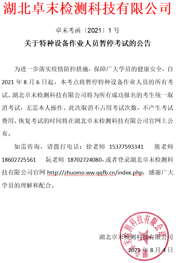 关于特种设备作业人员暂停考试的公告 发布时间:2021-08-04浏览: 字体大小[ 大 中 小 ]