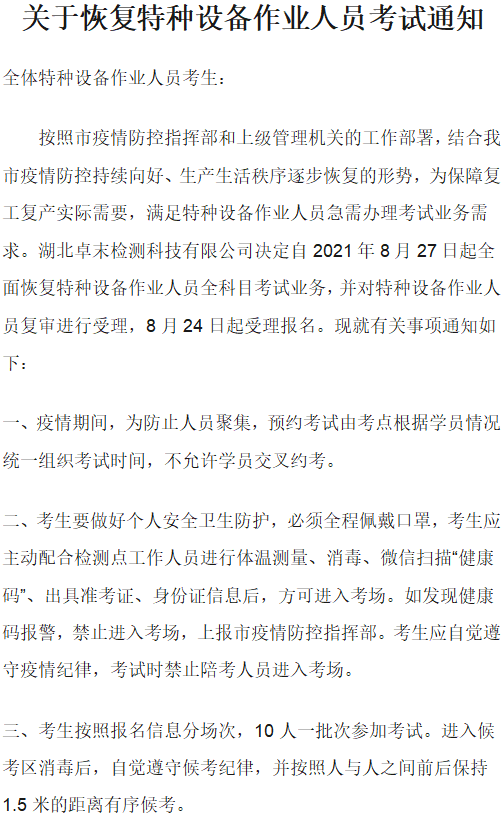 关于特种设备作业人员恢复考试的公告 发布时间:2021-08-24浏览: 字体大小[ 大 中 小 ]